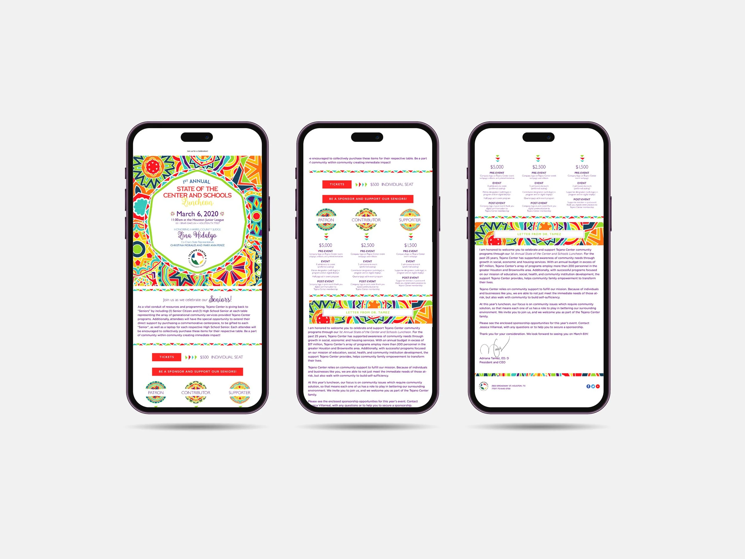This year’s focus was on “Seniors”—senior citizens and high school seniors. Each table pairs one senior citizen and one high school senior, representing the Tejano Center’s multi-generational community support. The creative reflects the culture of the Tejano Center and the community it serves. Pieces included: email invite, social media assets, program, table numbers, and thank you email.